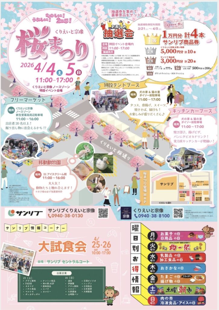 くりえいと宗像さくら祭り 2026.04.02 2026年 4/4土曜 5日曜 クリエイト宗像ノースゾーン特設イベント会場にて行われる桜まつり今年も「大島村商店」出店いたします。大島の塩はもちろん海藻類や大島甘夏など大島の旬をお届けに参ります。お天気は愚図つくようですが、美しく咲く桜を愛でる年に一度の機会をお見逃しなく。皆様のお越しお待ちしています。 Screenshot